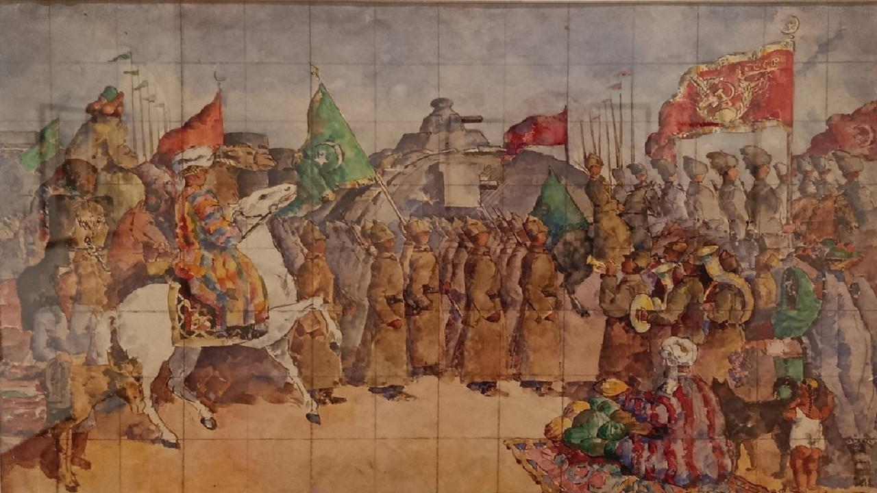 В центре развивается зелёный флаг Бухарской Народной Советской Республики (уже преобразованной к моменту написания акварели сначала в Бухарскую ССР, а затем - в Узб.ССР), несущий ещё над рядами красноармейцев цвет ислама с желтыми пятиконечной звездой полумесяцем (повёрнутым рожками от древка), и отдалённо напоминающий прежний штандарт эмира Бухарского, бежавшего от революции в Кабул.
