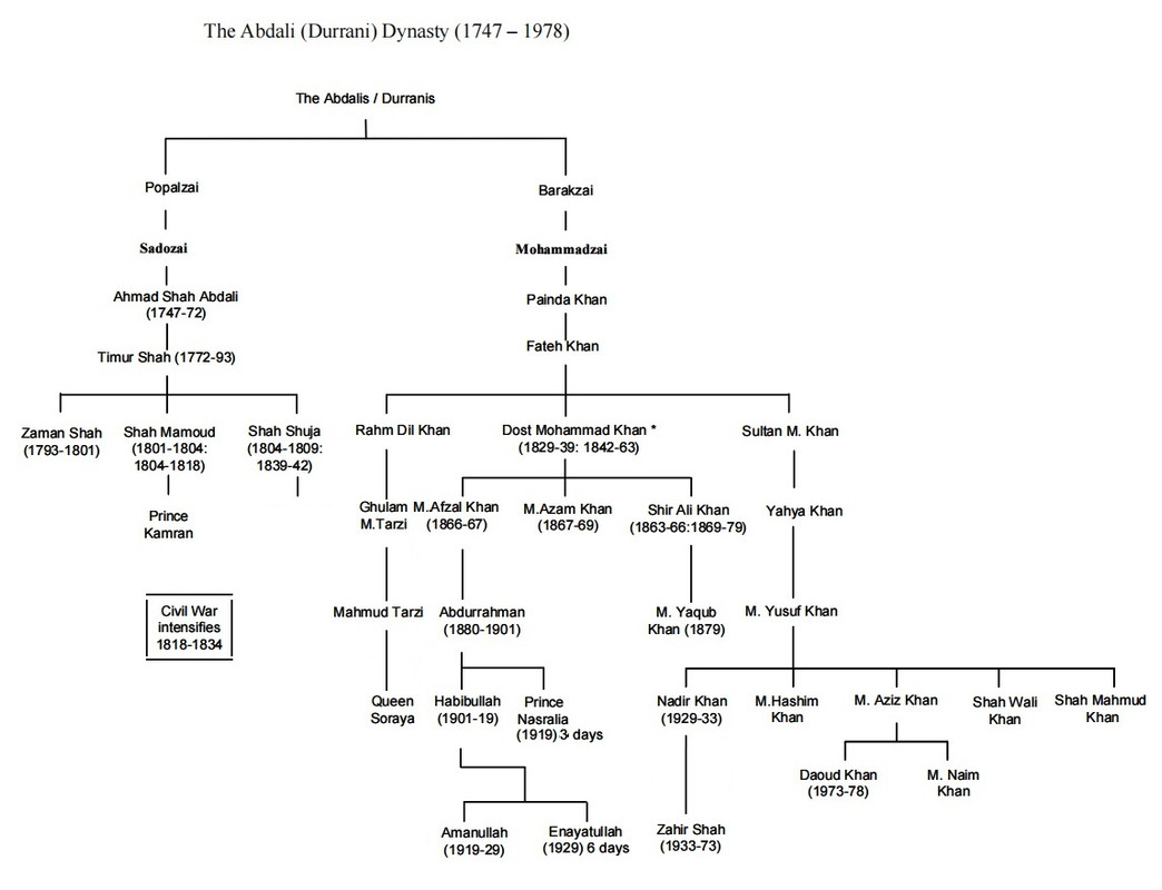 В ЗАСТАВКЕ: The Abdali (Durrani) Dynasty (1747 – 1978), генеалогическая схема родственных связей между правящих в Афганистане династий трёх разветвлений родов Дуррани, она немного мною скорректирована, подправлена и скомпонована для ещё более ясного представления поколенного соотношения. Я счёл правильным оставить её в языке оригинала.