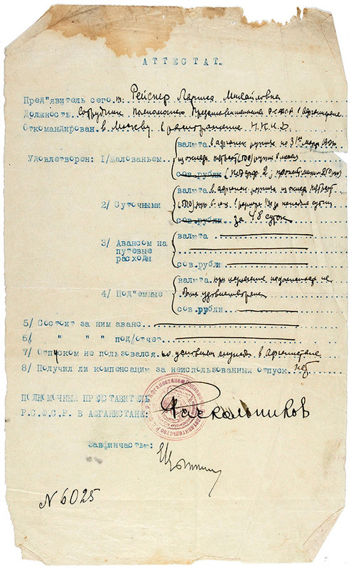 В ЗАСТАВКЕ: Бланк-форма " Командировочного" аттестата на предъявителя Л.М. Рейснер за подписью Ф. Раскольникова — полномочного представителя РСФСР в Афганистане. исход. № 6025, апр. 1923. 1 л. Надрывы листа, его сгибы разглажены, но загибы не тронуты, потёки. [машинопись, автограф Ф. Раскольникова, подпись полпреда и заверяющая подпись завфинчастью миссии, наложена гербов. печать полпредства].