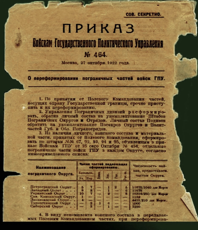 ПРИКАЗ № 464 (НАЧАЛО ИСТОРИИ КСАПО. 27.10.1922, о переформировании пограничных войск ГПУ* при НКВД Республики)