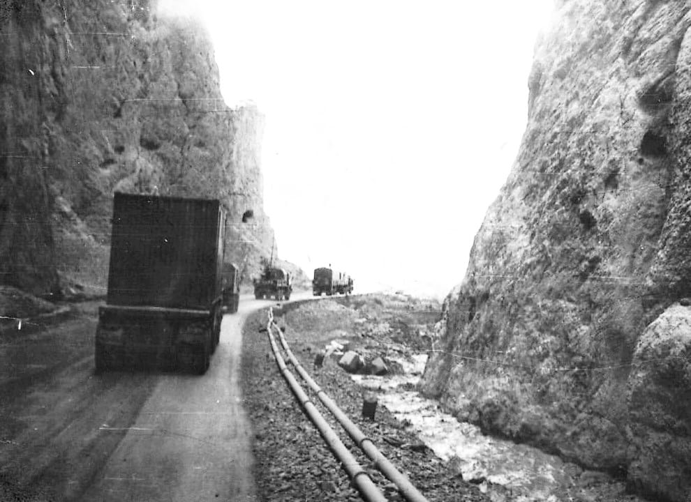 В ЗАСТАВКЕ: из сканов с потерянными описаниями*. Колонна авт. техники выезжает из Танги Пасс близ Ташкургана (Хульма), направление: Север-Юг. По контексту сбора: втор. пол. 1980ых годов. Авторство и правообладание мне неизвестны. Скан перевёрнут: см. нитку трубопровода вдоль русла Танги.