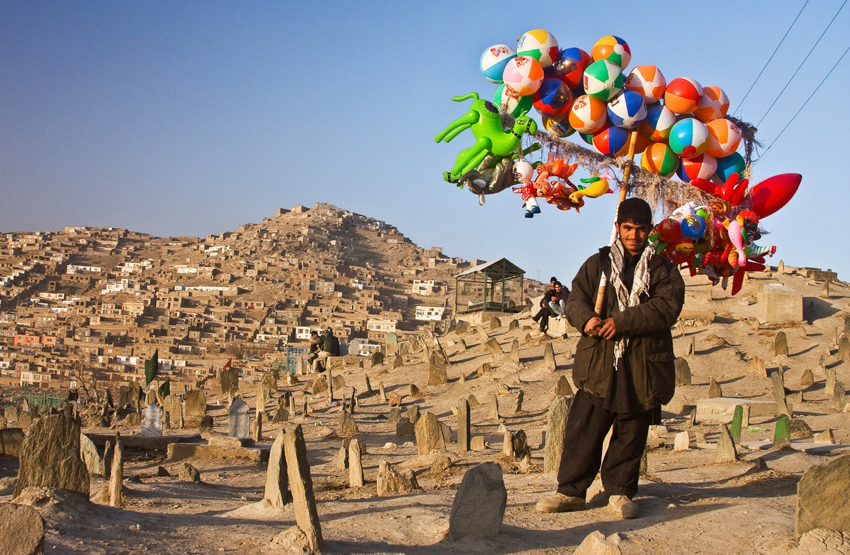 зубья земли и верблюды легче воздуха. Молодой человек - продавец воздушных шаров/بالون هوا/балон хава и змеев/بادبادک/бабадак проходит старинным кабульским кладбищем бедняков Карт-и-Сакхи, 16.12.2010